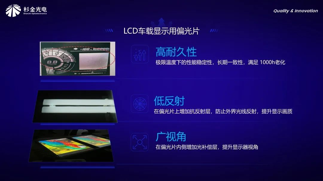 為提升駕駛安全性,車載顯示屏的清晰度規(guī)格日益嚴(yán)格,以確保駕駛員可從更廣的視角觀看屏幕,而非僅從正面觀看。這就需要車載顯示用偏光片滿足高對(duì)比度和廣視角的要求。針對(duì)車載偏光片更高的性能要求,杉金光電開(kāi)發(fā)了兩大類產(chǎn)品。