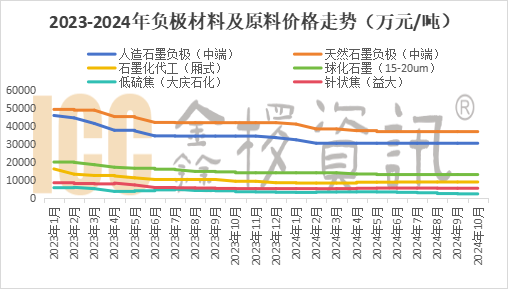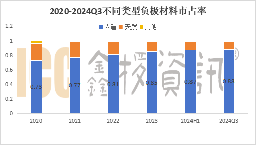 就材料類型來看,國內(nèi)人造石墨負(fù)極仍占據(jù)主流地位,人造負(fù)極占比不斷提升,2024年Q3占比達(dá)約88%,創(chuàng)歷史新高。