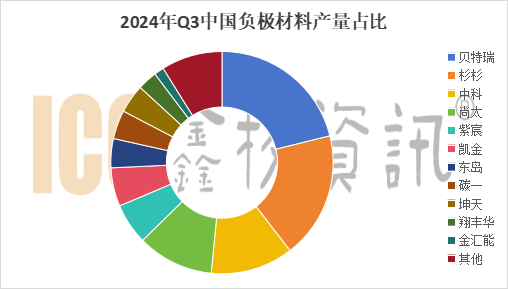 據(jù)ICC鑫欏資訊數(shù)據(jù)顯示,2024年Q3國內(nèi)人造石墨負(fù)極材料總產(chǎn)量約49萬噸,上海杉杉占比21%,憑借著領(lǐng)先的技術(shù)優(yōu)勢和市場地位,市占率仍居首位。